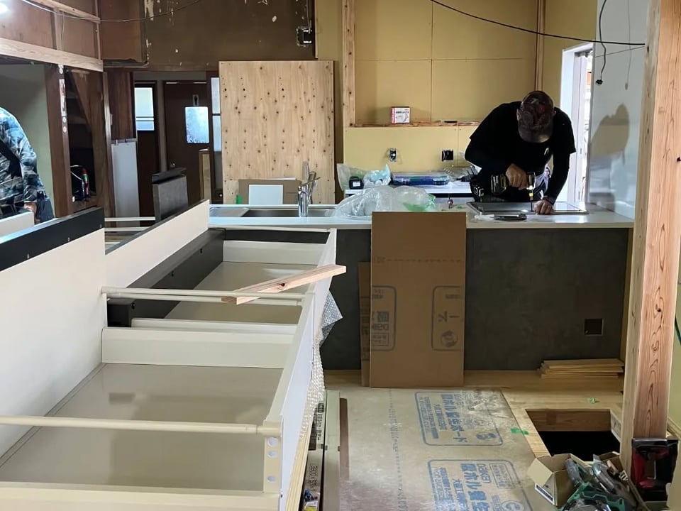 今日は佐賀県嬉野のМ様邸のキッチンの取付け作業の日です。DOOP糸島の杜モデルルームで使っていたキッチン、カップボードを再生して頂き大工さんも喜びの笑顔でした。今回のプロジェクトはDOOPがプロデュースして、М様にご提案させて頂きました。10月中旬の完成予定です。