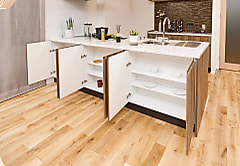 オーダーキッチンをセレクト。 床材(耳納杉)に合わせて、杉柾目の突板を使用。 金...