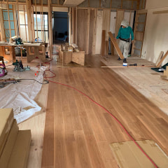 T様邸の施工状況です。 本日から床を貼り初めました。 床材はナラを使用。 廊下か...