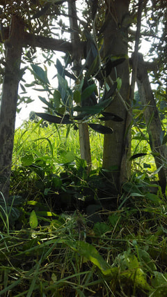 オリーブ畑で猛暑の中、蔽い茂った草を刈って手入れを行いました。 4年前に植樹した...
